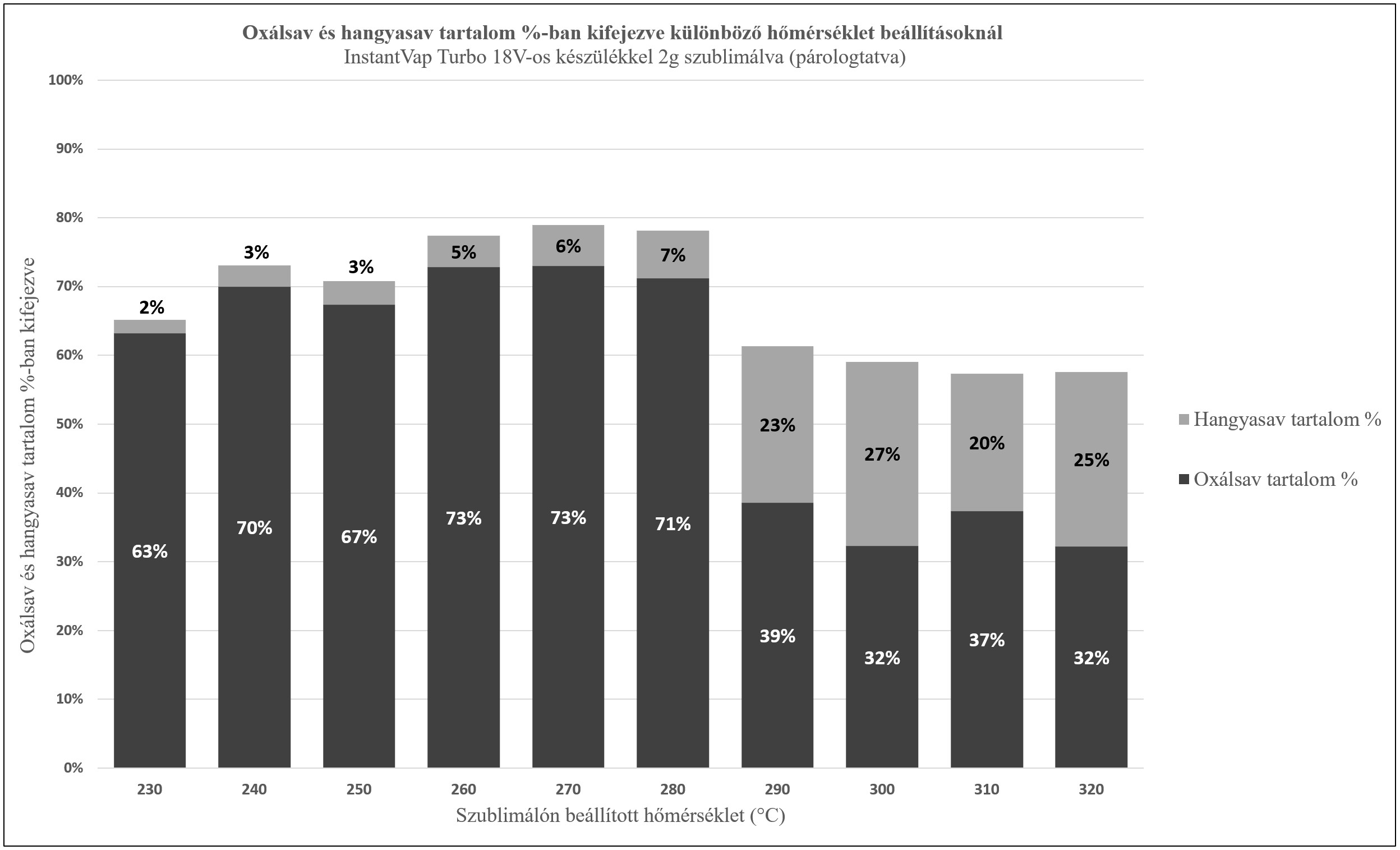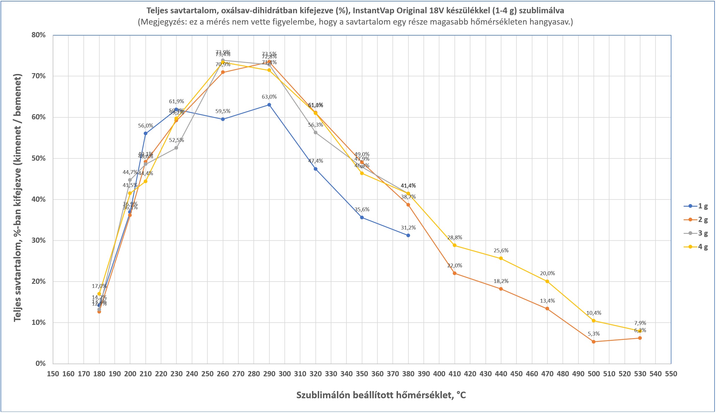 Az üvegcsövekből kondenzált gőz összegyűjtésével és kémiai elemzésével sikerült számszerűsíteni, hogy különböző hőmérsékleteken mennyi oxálsav távozik valójában a párologtatóból.