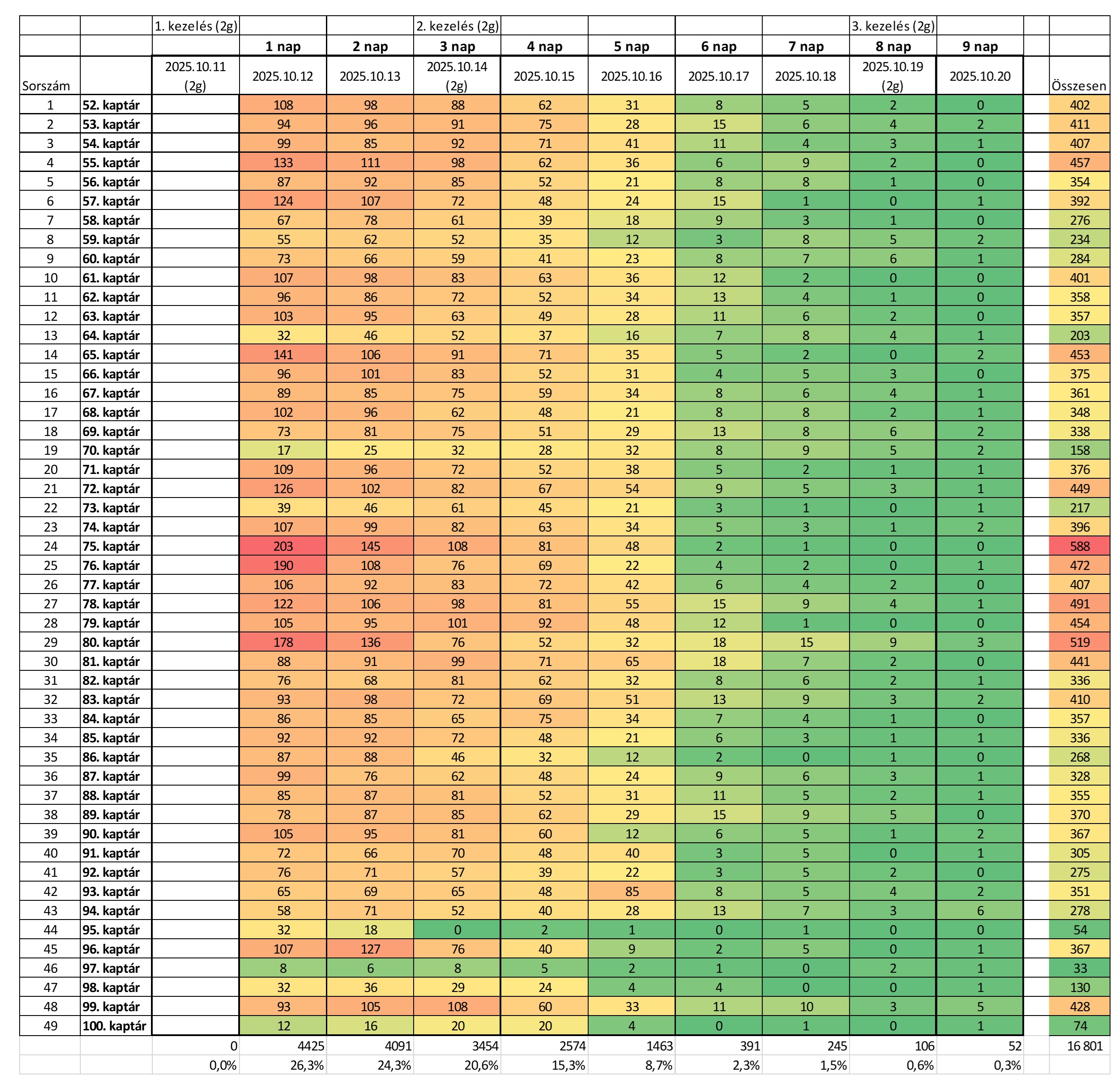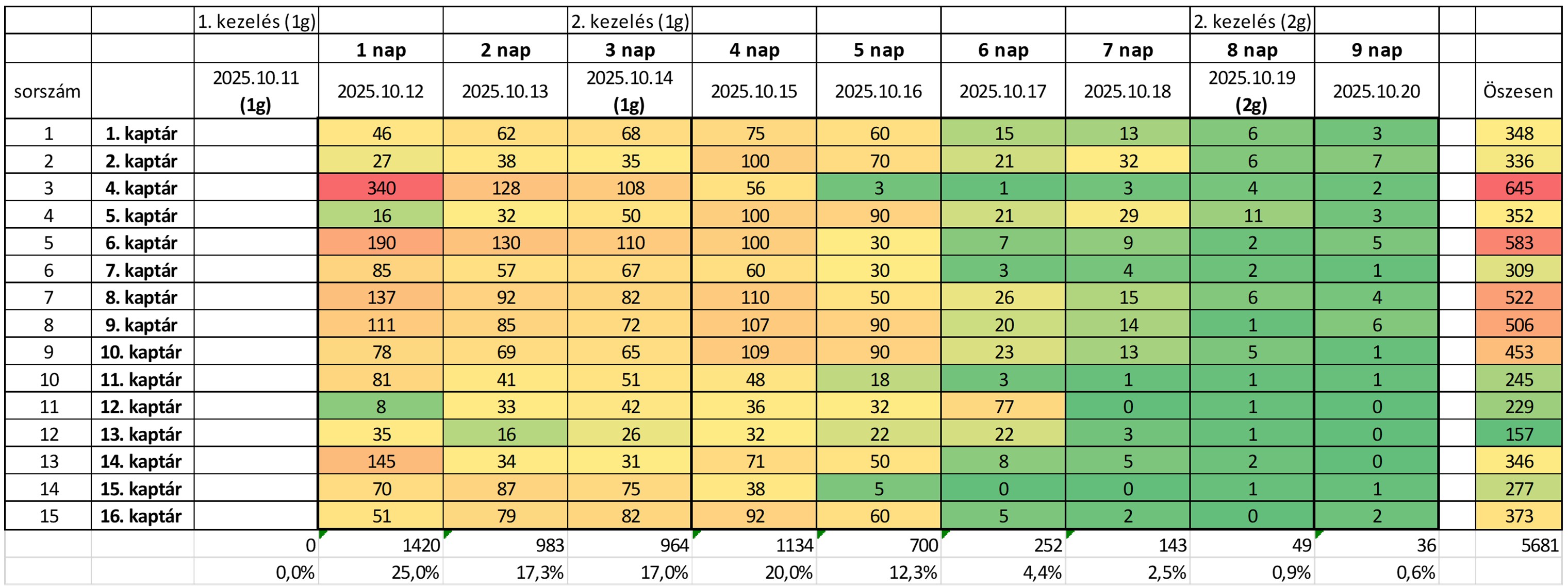 Fiasmentes állapotban az őszi zárókezelés azt mutatja, hogy a Turbo készülék olyan jól elkavarja a kaptárban az oxálsavat a nagy befújási sebessége által, hogy 2x1g is már hatásosnak bizonyul.: