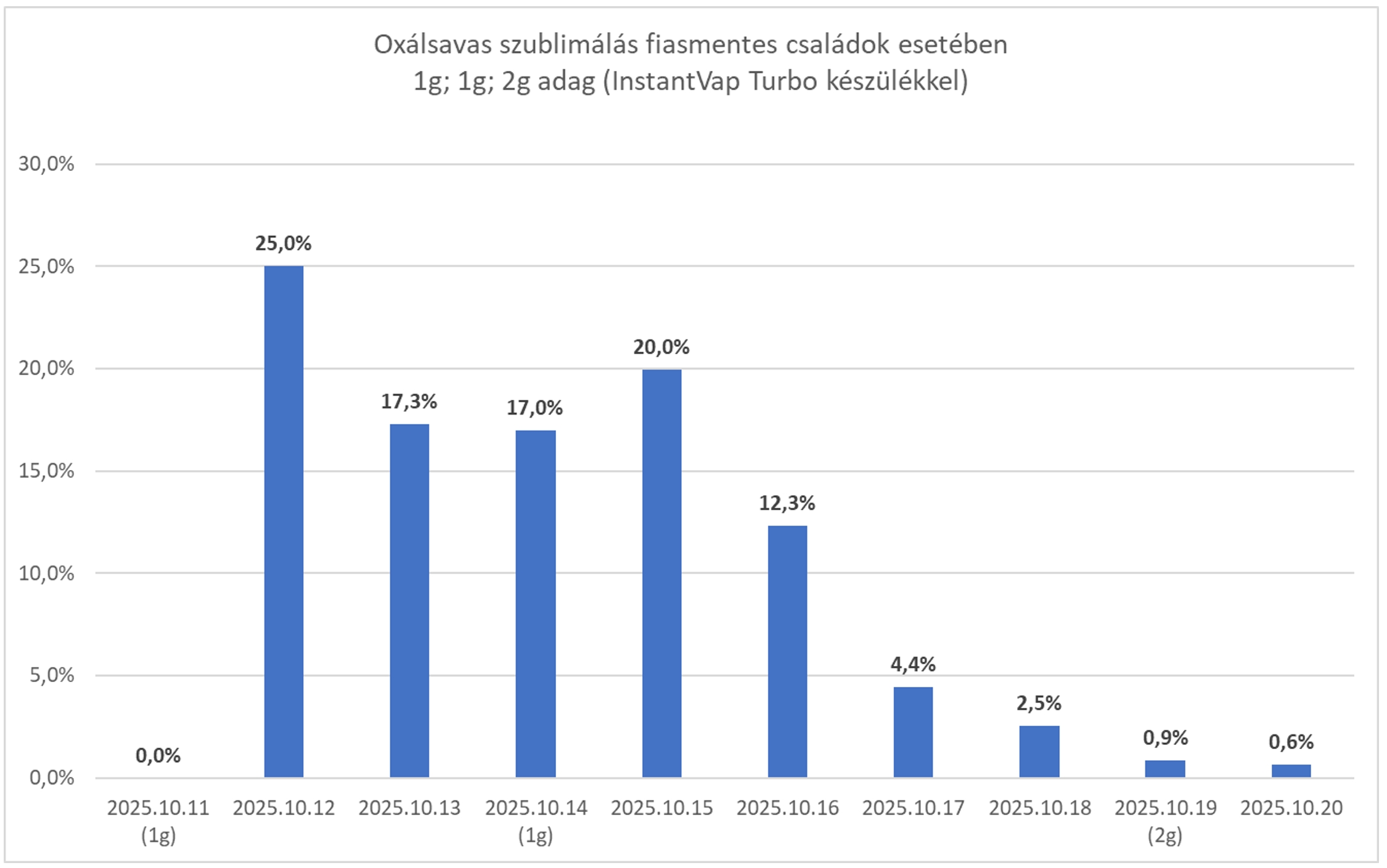 Megjegyzés: 1 g OA párologtatásakor a Leidenfrost-effektus korábban jelentkezik, mint 4 g adagolásakor. Sok modern eszköz esetében a 245–260 °C körüli beállítási pont egy jó kompromisszumot jelent, amely elég meleg ahhoz, hogy gyors, Leidenfrost-effektus nélküli párologtatás érhető el, ugyanakkor a bomlás domináns tartomány alatt marad. Nagyobb adagok esetén enyhén magasabb kezdő hőmérsékletre lehet szükség a hűtés kompenzálásához, de a hőmérsékletnek e tartományon túli emelése nem jár előnnyel, és növeli a kockázatot.