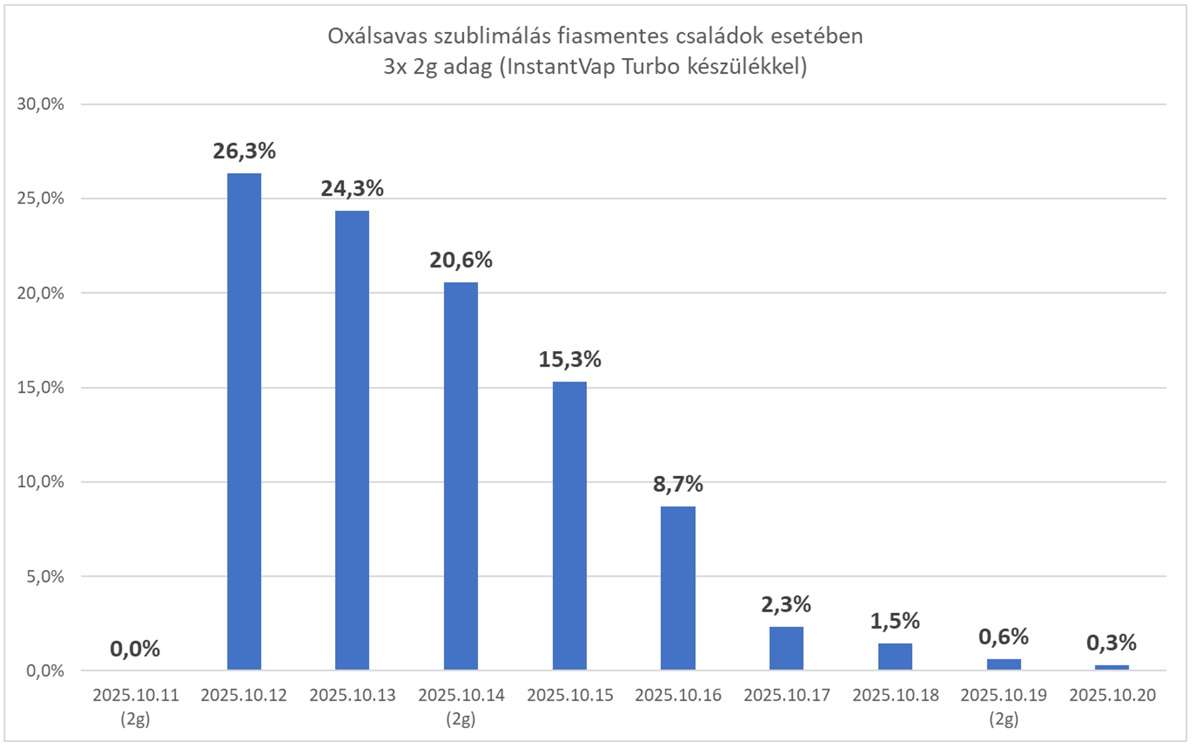 Az InstantVap Turbo az első olyan készülék a piacon, ami több hónapos mérésnek és fejlesztésnek az eredményeképpen úgy lett optimalizálva, hogy a gyorsaság és a hatékonyság találkozik. Az ideális hőmérséklet ennél az üst elrendezésénél 260 °C, ahol a 2g oxálsav mindössze 10mp alatt bejut a kaptárba 73%-os hatékonyság mellett.