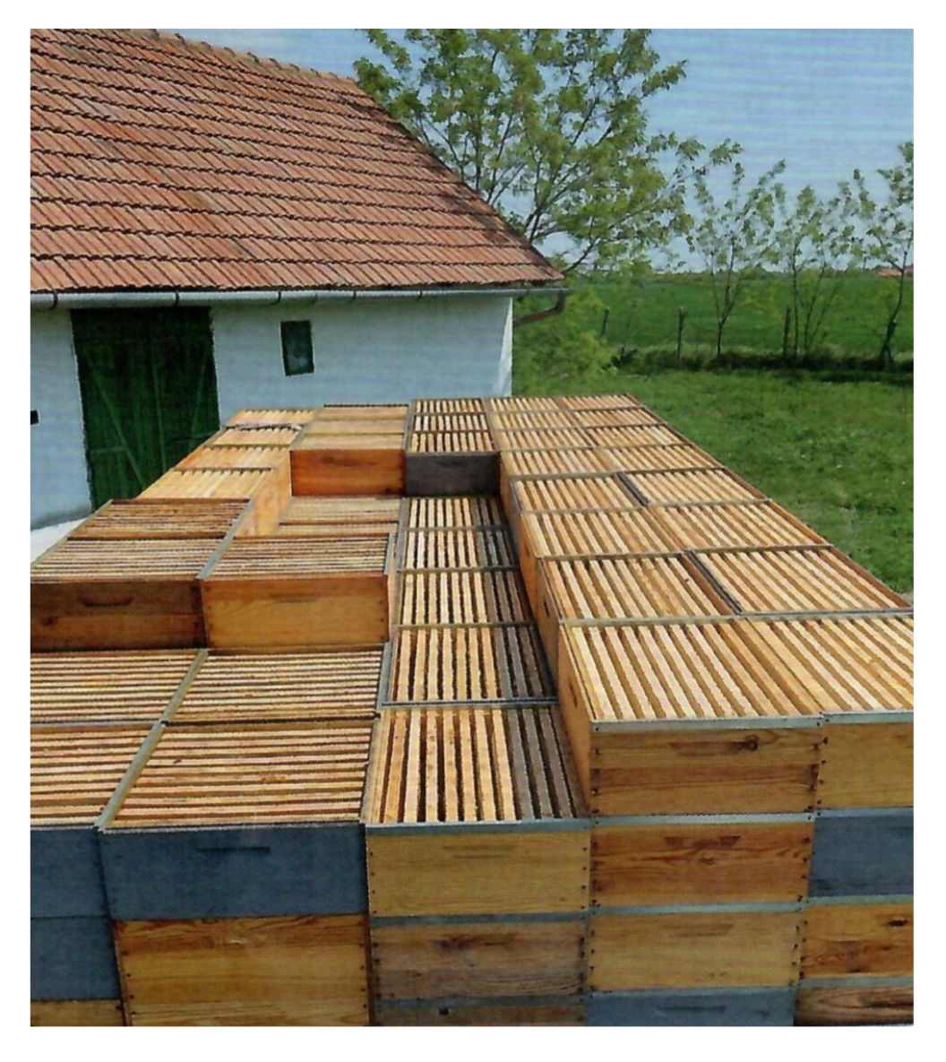 Tovább gondoltam a dolgot. Készítettem egy akkora „fiókot” amibe csak egy keret fér el fektetve körben méhjárattal. Ezt napraforgón az aljdeszkára helyeznénk, és saját anyaráccsunkkal erre zárjuk az anyát. Napraforgó végére a fiasítás a rács felett teljesen kikel, az atka egy kereten elvehető. Az anya ezen az egy kereten könnyen megtalálható és cserélhető. Számítok a fiasítás nélküli családtól egy fiók plusz mézre, az új anyától egy nagyobb betelelő fészekre, tavasszal pedig robbanásszerű fejlődésre. 10 családdal ezt már az idén kipróbáltuk, sajnos csak napraforgó után. Az anya tovább fiasít a fekvő keret mindkét oldalán, semmilyen gondot nem okozott számára a kialakított szituáció. Az idén tehát 2025-ben egy teljes telephelyen próbáljuk ki napraforgó virágzása alatt ezt a módszert. Daruval a rács fölötti összes fiók elvehetővé válik.